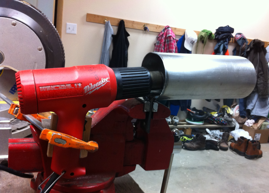 To complete my super professional bending iron I inserted a heat gun with a scoop to blow hot air onto the inside top of the pipe.  Actually I will say that by the end of bending my sides I was quite pleased with how well this setup worked – it just took a while for me to figure out how to use it.