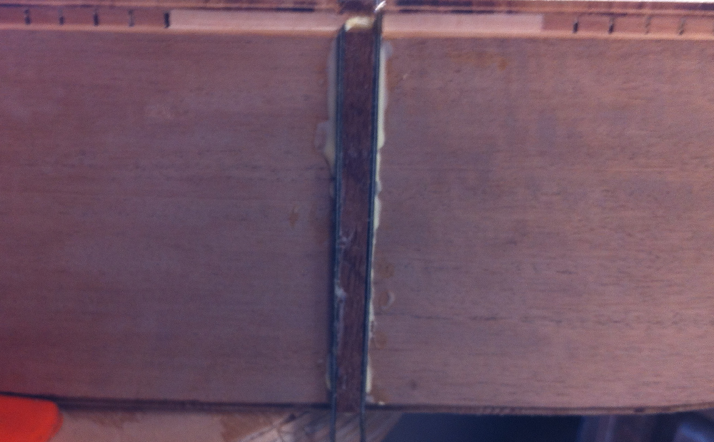 Once the glue dried I used a scraper to bring the wood binding and laminate flush with the body. The results are shown below.