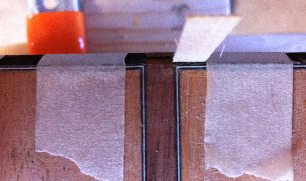 Next I glued in all of the laminate strips, taking a lot of time to make sure the layers matched up nicely. I used tape to hold the strips down while the glue dried which I found worked pretty well. The installation process wasn’t really as hard as I’d initially imagined. I started at one end and got the joint to match up the way I wanted and then proceeded to glue the strip down a little bit at a time until I got to the other end and then I slowly cut back the strip with a chisel until I got that joint to match up just the way I wanted it.