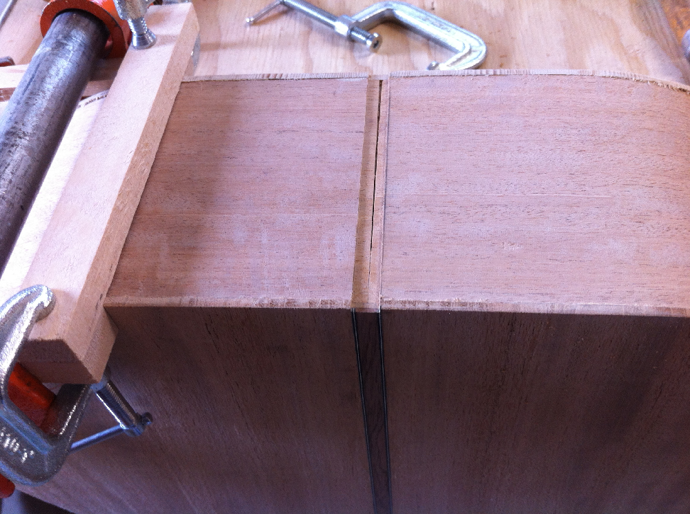 After all the channels were routed out I glued the binding into the bottom channel. That part was easy since it was flat and I didn’t have to bend any of the wood.