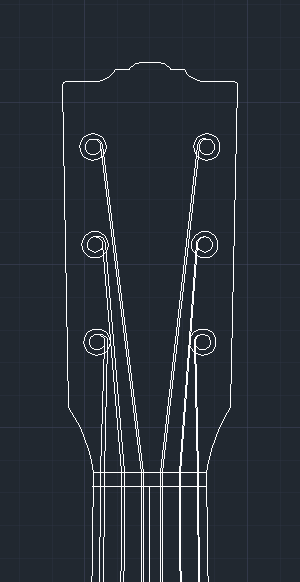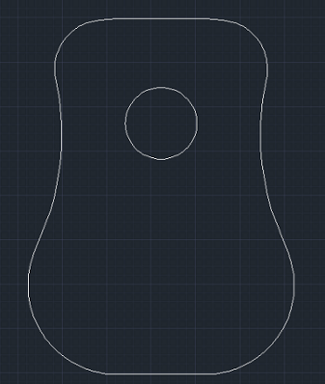 The shape of the body was the first step I took in the design of the guitar.  Following the advice of  Natelson and Cumpiano I chose to make a fairly normal sized guitar body, approximately 20 inches long by 16 inches wide.  I used AutoCAD (I had a free student version) to refine the curves until I was happy with the result as shown below.  I will say if I had to do this all over again I would most certainly do the design again in a computer drafting program of some sort, it just made it really easy to get measurements on any part of the guitar that I wanted.