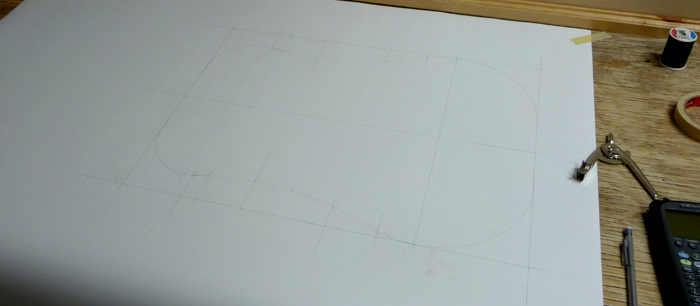 The body template was the next task I accomplished. I made it using a piece of plotting paper. It actually worked out pretty well for a template, its cheap and easy to cut and I’d use it again. Of course it would be ideal to have a nice big plotter and plot it straight from my AutoCAD drawing file, but I was able to translate the shape fairly accurately by hand with a ruler, compass and a calculator as shown below. One point of interest was the curve of the waist. It wasn’t a circular arc so I couldn’t use a compass to draw it. Somewhere (either from Natelson and Cumpiano or Sevy) I got the idea of using a piece of hardened springy wire to act as a guide for drawing the arc and I found that that worked really well. I simply marked out a point on the waist curve and used it and the end points of the waist curve as the three points to define the arc (I had to get help holding the wire in place while I traced the curve).